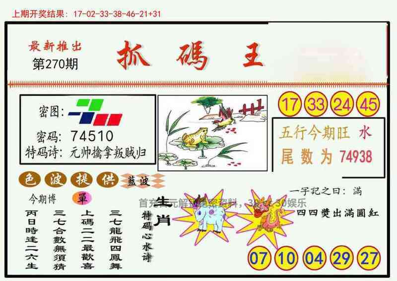 【精解抓码王】开(發00) 275期:岁岁金河复玉关 【主攻抓肖】猪马兔牛鸡狗龙蛇鼠 【抓码尾数】01479 【抓码双波】蓝红波 【主攻抓码】31.43.12.03.05.09.08.02.01.06 |